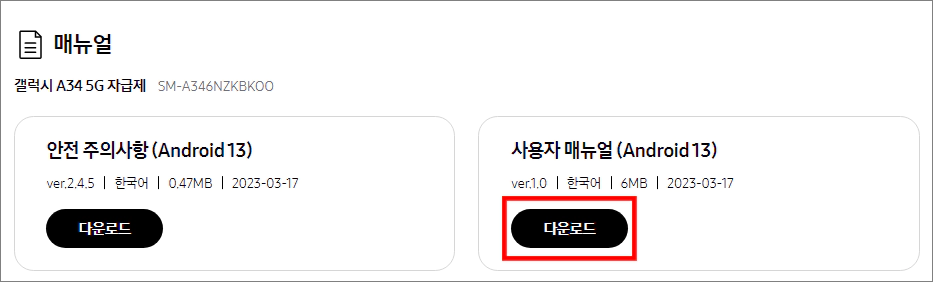 매뉴얼 위치에는 2개 파일이 등록되어 있는데 우리가 확인해야 하는 파일은 사용자 매뉴얼입니다. 다운로드 버튼을 클릭하면 바로 인터넷 브라우저에서 매뉴얼 파일이 열릴 거예요.