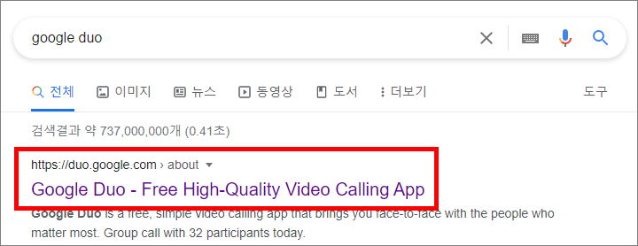 프로그램을 설치하지 않고 인터넷 사이트로 접속해서 이용하는 방법이기 때문에 검색을 잘해주셔야 하는데요. 네이버, 구글 사이트에서 Google Duo를 검색하시면 검색 결과 상단에 나옵니다. 아쉽게도 다음에서는 사이트가 나오지 않더라고요. 진짜 검색 결과 개선이 필요해 보입니다.