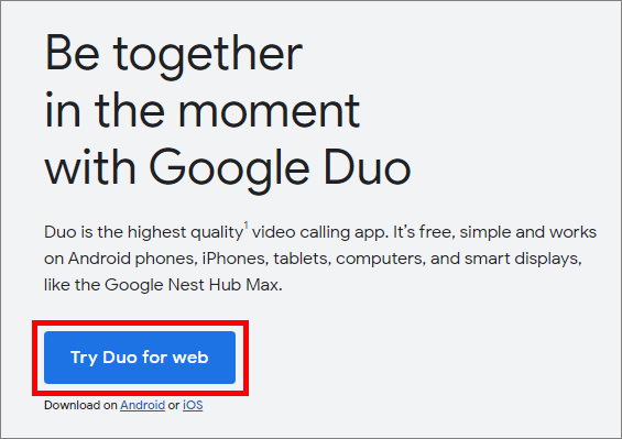 구글 듀오 (Google Duo) 사이트를 접속하면 영어로 내용이 적혀있는데 파란색 버튼에는 웹에서 듀오를 사용해보라고 적혀있습니다. 아무 브라우저에서나 구글 듀오 (Google Duo) 사이트로 접속해서 사용할 수 있는 것은 아니고 크롬, 엣지, 파이어폭스, 오페라, 사파리 브라우저에서 사용할 수 있다고 하니까 여러분들이 어떤 브라우저로 접속했는지에 따라서 사용하지 못할 수 있다는 것은 참고하셔야 합니다.