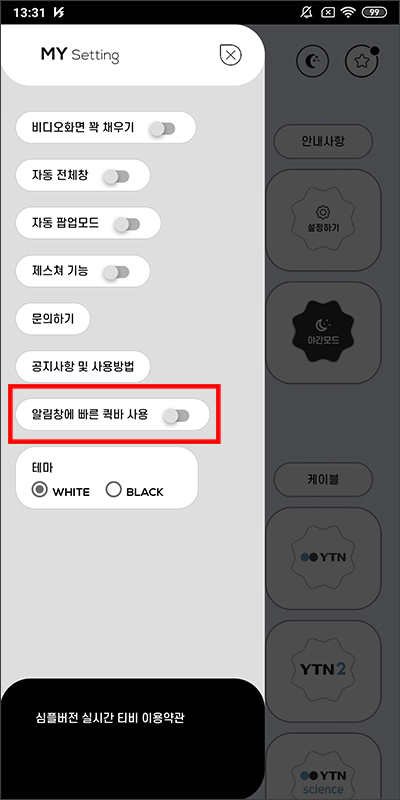 심플티비 앱은 설치 이후에 스마트폰 상단 알림 창에 퀵 바가 추가됩니다. 불편하신 분들은 앱 화면 왼쪽 상단에서 메뉴 버튼을 터치하고 슬라이드 메뉴가 열리면 알림 창에 빠른 퀵바 사용 설정을 터치해서 해제해주세요. 다양한 방송 종류와 채널이 추가되어 있어서 사용하시는데 만족함을 느끼시지 않을까 생각합니다.