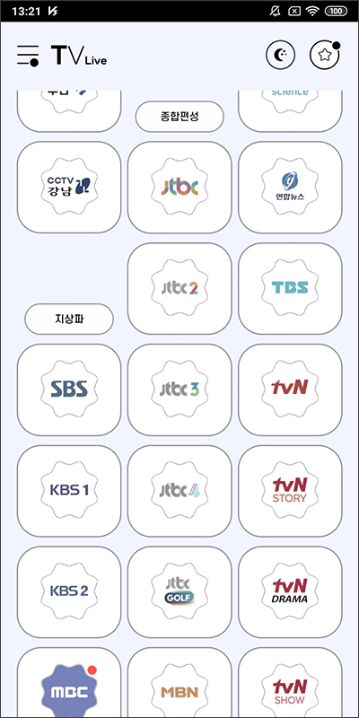 심플티비 앱 설치가 완료되었다면 실행을 해주세요. 앱 메인 화면은 위와 같이 채널 종류와 방송국 이름을 확인할 수 있습니다. 방송 시청을 원하는 채널 버튼을 터치하시면 바로 실시간 방송을 확인하실 수 있어요.