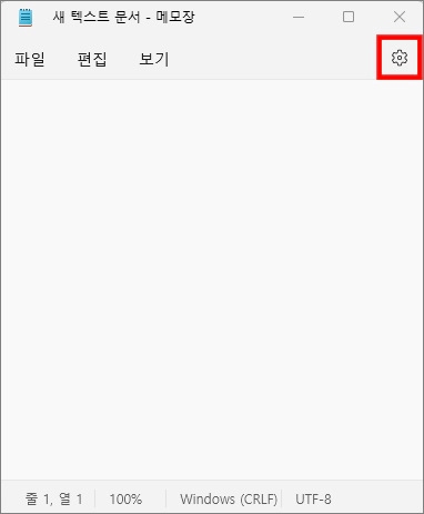 먼저 메모장을 실행해주세요. 그리고 오른쪽 상단을 보시면 지금까지 보이지 않았던 톱니바퀴가 추가되어 있는 것을 확인하실 수 있을 거예요. 클릭합니다.