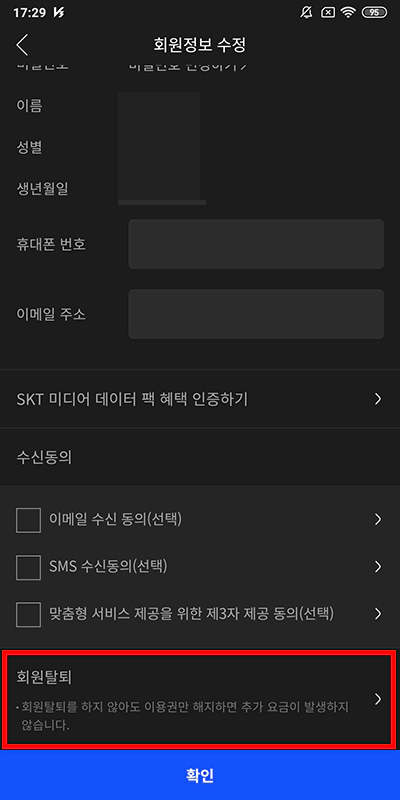 이제 여러분들이 로그인하신 회원 정보를 확인하는 화면으로 넘어왔어요. 따로 터치해야 하는 것은 없고 맨 밑에서 회원 탈퇴를 터치하면 됩니다.
