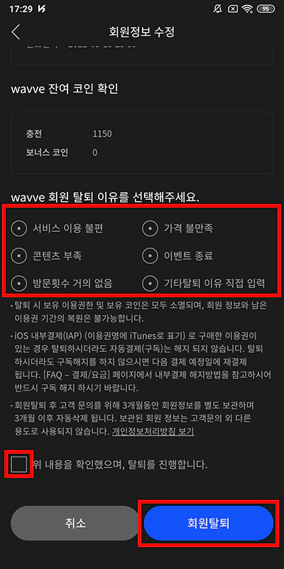 이유 선택을 하셨으면 페이지 밑에서 체크를 해주시고 회원 탈퇴 버튼을 클릭하여 웨이브 탈퇴를 할 수 있어요.