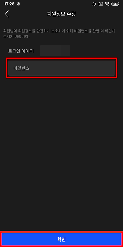 회원 정보를 확인하려면 현재 계정 비밀번호를 입력해야 했었죠. 어플도 마찬가지입니다. 비밀번호 입력 후 확인 버튼을 터치하세요.