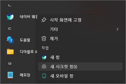 다음은 작업 표시줄에 시작 버튼을 클릭하면 열리는 시작 화면에서 모든 앱 버튼을 클릭하고 설치된 프로그램 목록에서 ㄴ 항목 네이버 웨일 아이콘에 마우스 우클릭을 해보세요. 위에 설명과 마찬가지로 새 시크릿 창이 있습니다. 클릭하면 시크릿 모드로 실행할 수 있어요.