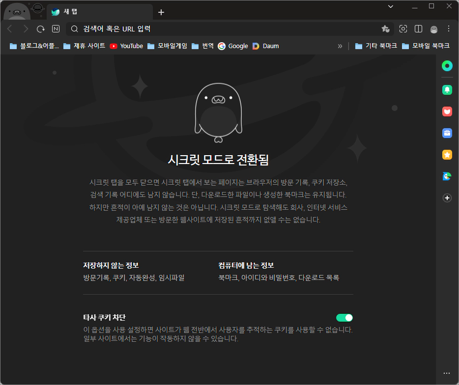 이렇게 따로 웨일에서 시크릿 모드를 클릭하지 않아도 바로 실행이 가능합니다. 시크릿 모드로 사용할 때 저장되지 않는 정보는 사이트 방문 기록, 쿠키, 자동 완성, 임시 파일로 이런 파일 찌꺼기가 남는 것을 실행하는 분들 많으셨을 거예요. 이제 웨일 시크릿 모드로 사용하시면 됩니다.