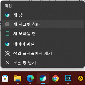 작업 표시줄에 고정해놓은 웨일 브라우저 아이콘이 있습니다. 평소에는 마우스 클릭으로 바로 실행하셨지만 이제 마우스 우클릭으로 새 시크릿 창을 클릭하여 시크릿 모드로 실행해보세요.