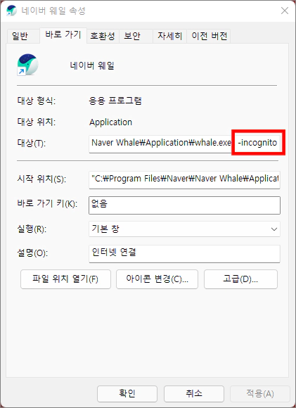 바탕 화면에 웨일 브라우저 바로 가기에서 마우스 우클릭을 해주시고 속성을 클릭하면 위와 같은 창을 열 수 있습니다. 그리고 속성 창 화면 대상 부분에 입력된 내용 맨 마지막으로 이동해서 한 칸 띄고 -incognito 명령어를 입력해주세요. 이제 확인 버튼을 클릭해서 속성 창을 닫으면 됩니다.