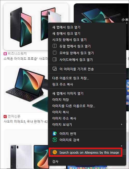 확장 프로그램 설치가 완료되면 바로 알리익스프레스 사진 검색이 가능합니다. 찾아보고 싶은 제품 사진에서 마우스 우클릭을 해보세요. 그러면 위와 같이 메뉴가 열리는데 아래쪽에 Search goods on Aliexpress by this image가 추가되어 있습니다. 클릭해서 검색할 수 있어요.
