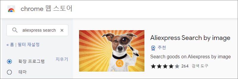 크롬 웹스토어로 검색을 하셨으면 왼쪽에서 검색을 해주시면 되는데요. 영어로 Aliexpress Search로 검색하면 됩니다. 그러면 꽤 많은 알리익스프레스 사진 검색 확장 프로그램이 나오는데 제가 추천하는 것은 캡처 이미지에 보이는 강아지가 돋보기를 들고 있는 확장 프로그램입니다.