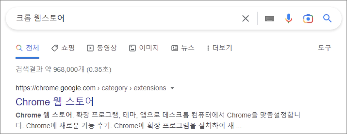 네이버, 다음, 구글 아무 곳에서나 크롬 웹스토어로 검색을 해주세요. 이렇게 캡처 이미지 한 장으로 크로미움 기반 브라우저인 엣지, 웨일, 크롬 브라우저에서 확장 프로그램을 설치하는 화면으로 바로 이동하는 방법을 설명할 수 있습니다.