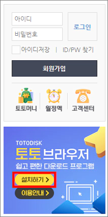 토토디스크 사이트로 접속하시고 화면 왼쪽을 보시면 계정을 입력하는 공간 밑으로 토토브라우저 이미지가 보이실 거예요. 설치하기 버튼과 이용안내 버튼이 있으니 설치하기 버튼을 클릭하시면 됩니다. 그러면 바로 토토브라우저 설치 파일 다운로드가 시작돼요.