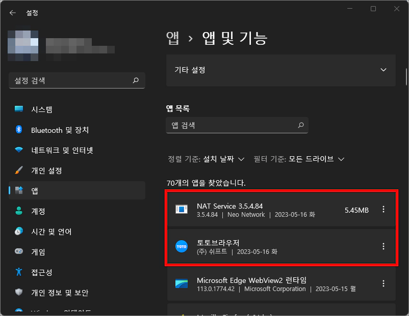 앱 및 기능이 열리면 여러분들 PC에 설치되어 있는 프로그램을 목록을 살펴볼 수 있는데요. 스크롤하면서 토토브라우저를 제거하면 끝나는 게 아닌가 싶었지만 설치 날짜로 정렬을 해보니까 토토브라우저 외에 NAT Service 프로그램도 같이 설치가 되었더라고요. 두 개 프로그램을 제거해주셔야 합니다. 제거 방법은 프로그램 이름 오른쪽에 점 3개 찍혀있는 버튼을 클릭하고 제거를 선택하면 해당 프로그램을 제거할 수 있어요.
