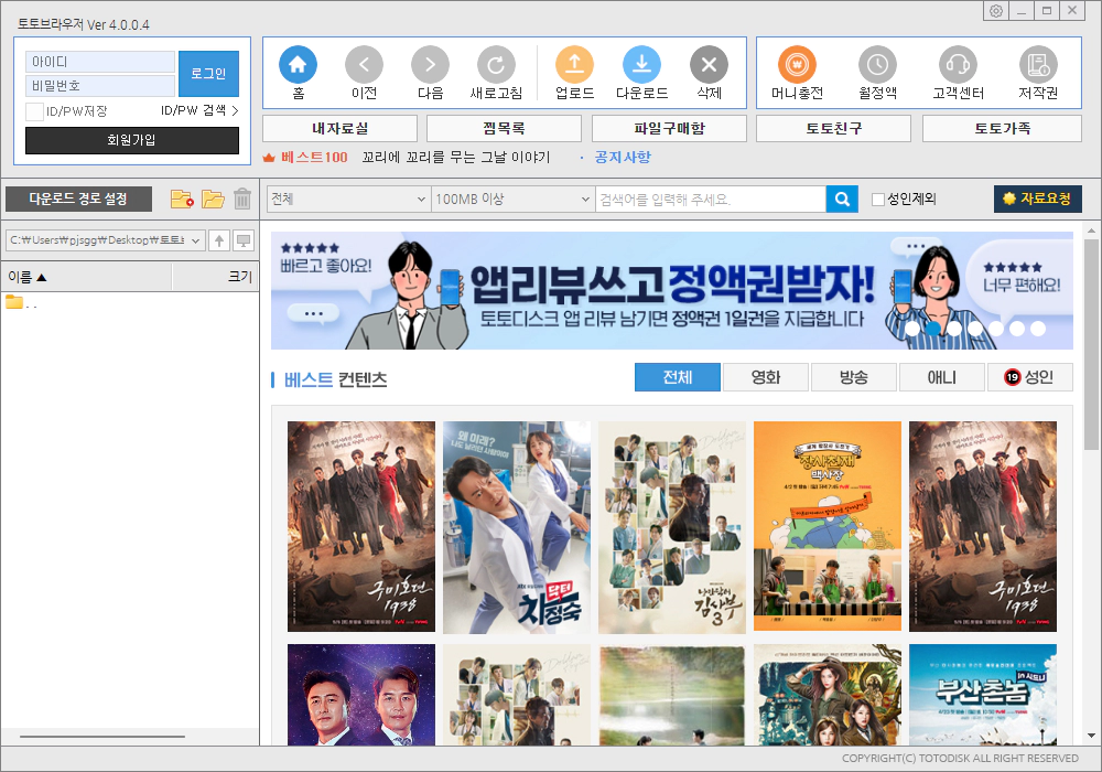 토토브라우저 설치 파일을 실행해서 프로그램 설치를 진행합니다. 설치 과정에 스폰서 바로가기나 광고 프로그램 추가 설치 기능은 없었으니 따로 설명은 생략하고 그냥 진행하시면 바로 설치할 수 있어요. 위와 같이 토토브라우저 설치가 완료되고 실행을 해보시면 왼쪽 상단에 로그인을 해주셔야 다운로드를 할 수 있습니다. 검색은 로그인을 하지 않아도 할 수 있더라고요.