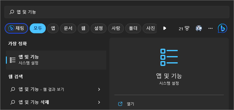 이제 토토브라우저 제거 방법을 알려드리도록 하겠습니다. 프로그램을 유용하게 잘 사용하다가 오랜 시간 사용하지 않게 되면 용량 정리를 위해서 사용하지 않는 프로그램을 제거하게 되는데요. 작업 표시줄에 검색을 클릭하고 앱 및 기능을 입력해 주세요. 그러면 시스템 설정에 앱 및 기능이 검색됩니다. 키보드에 엔터키를 누르거나 마우스로 클릭해서 실행해 주세요.