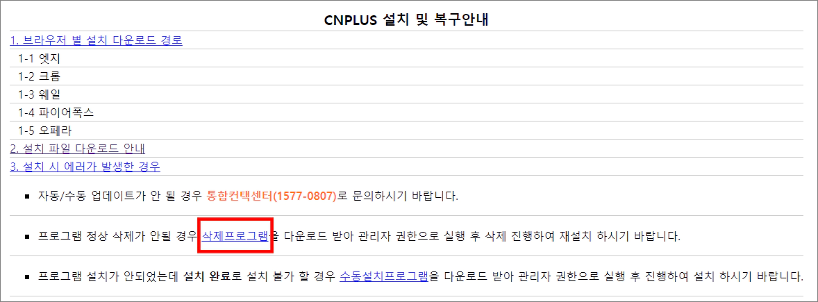 구글에서 CNPLUS 검색을 해주시고 검색 결과 첫 번째로 나오는 링크를 클릭하여 사이트에 접속합니다. 그리고 페이지 내용을 보시면 설치 및 복구안내 내용이 있을 거예요. 설치하는 방법도 확인할 수 있고 오류가 발생했을 때 대처 방법도 확인할 수 있는데요. 삭제프로그램이라는 링크가 있습니다. 클릭하면 파일을 하나 다운로드할 수 있어요.