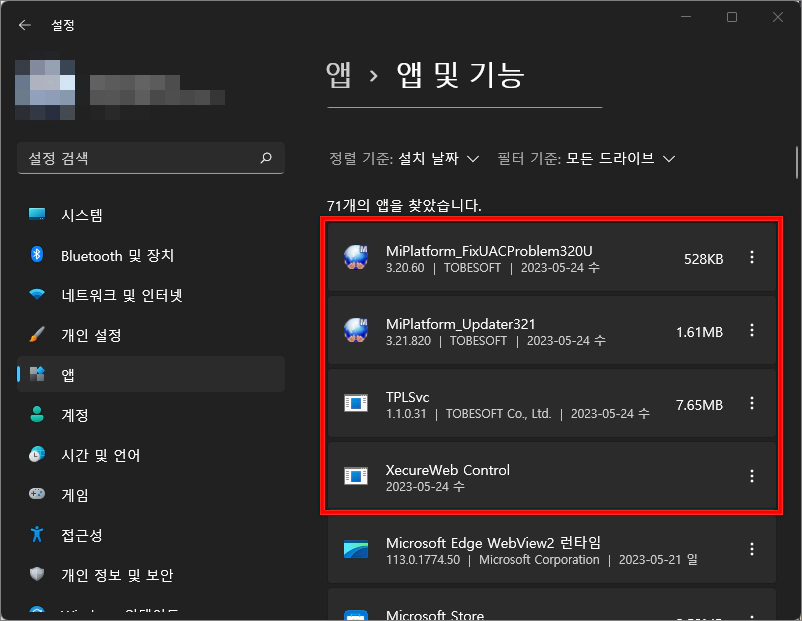 명령프롬프트 창이 닫히면 CNPLUS 재설치를 위한 삭제는 완료된 것입니다. 이제 프로그램을 사용하지 않아서 깔끔하게 관련된 프로그램을 제거하기 위한 방법을 추가로 알려드릴게요. 작업 표시줄에서 검색을 클릭하면 열리는 화면에 앱 및 기능을 입력합니다. 그러면 검색 결과 가장 정확 부분에서 앱 및 기능을 확인하실 수 있을 거예요. 마우스로 클릭하시거나 키보드에 엔터키를 눌러서 위와 같은 창을 열어볼 수 있습니다. 위에 캡처 이미지에 표시된 4개 프로그램이 CNPLUS 프로그램을 설치하면서 추가로 설치된 프로그램입니다. 오른쪽에 점 3개 찍혀있는 버튼을 클릭해서 프로그램 제거를 해주세요. 4개 프로그램을 모두 제거하셔야 깔끔한 제거가 완료된 것입니다.