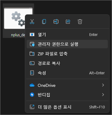 다운로드가 완료된 nplus_del 파일에 마우스 우클릭을 해주시고 우클릭 메뉴에 있는 관리자 권한으로 실행을 클릭합니다.