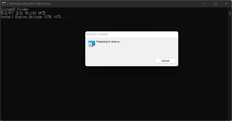 명령프롬프트 창이 열리고 삭제를 진행하는 내용이 나오는데요. 설치 과정과 마찬가지로 아무 키나 누르라는 내용이 나오면 키보드에 아무 키나 눌러서 진행을 해주셔야 삭제를 진행할 수 있습니다. 그리고 삭제가 진행되는 프로그램 화면에서 next 버튼을 클릭해야 삭제를 진행할 수 있는 경우도 있으니까 화면에 뜨는 창을 잘 보면서 삭제를 진행해 주세요.