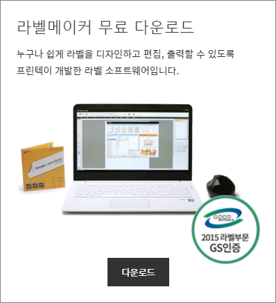 프린텍 공식 스토어로 접속하시면 페이지 오른쪽에 위와 같이 라벨메이커 무료 다운로드 항목을 찾을 수 있습니다. 바로 다운로드 버튼도 밑에 있네요. 다운로드 버튼을 클릭하면 애니라벨 라벨메이커 다운로드를 할 수 있습니다.