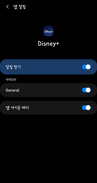 삼성 스마트폰에서 디즈니플러스 앱 알림 설정 화면으로 이동하면 위와 같은 내용이 보이실 거예요. 안드로이드 버전과 스마트폰 종류에 따라서 추가로 설정이 더 있거나 더 없거나 할 수 있습니다. 앱 자체에서 오는 모든 알림을 받고 싶지 않다면 알림 받기 설정을 터치해서 비활성화해 주세요. 알림은 오지만 상단에 아이콘이 뜨지 않게 하고 싶다면 앱 아이콘 배치 설정을 비활성화하시면 됩니다.