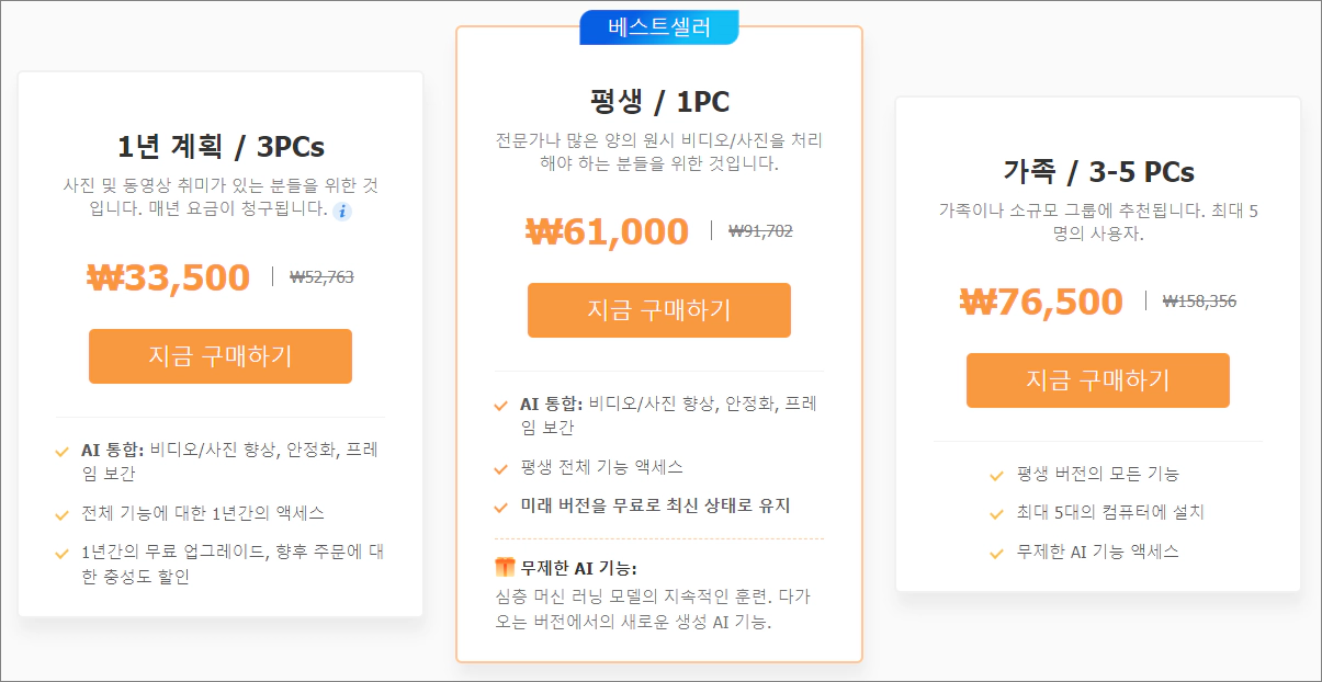 혹시라도 유료 결제에 관심 있으신 분들은 위 가격을 확인해 주세요. 1년 결제 요금, 평생 1PC 결제 요금, 3-5PC 가족 결제 요금이 있네요.