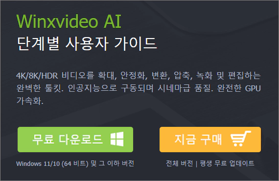 바로가기 버튼을 클릭해서 사이트로 이동하면 위와 같이 다운로드 버튼을 확인할 수 있습니다. 버튼을 클릭하면 바로 Winxvideo AI 설치 파일을 받을 수 있어요.
