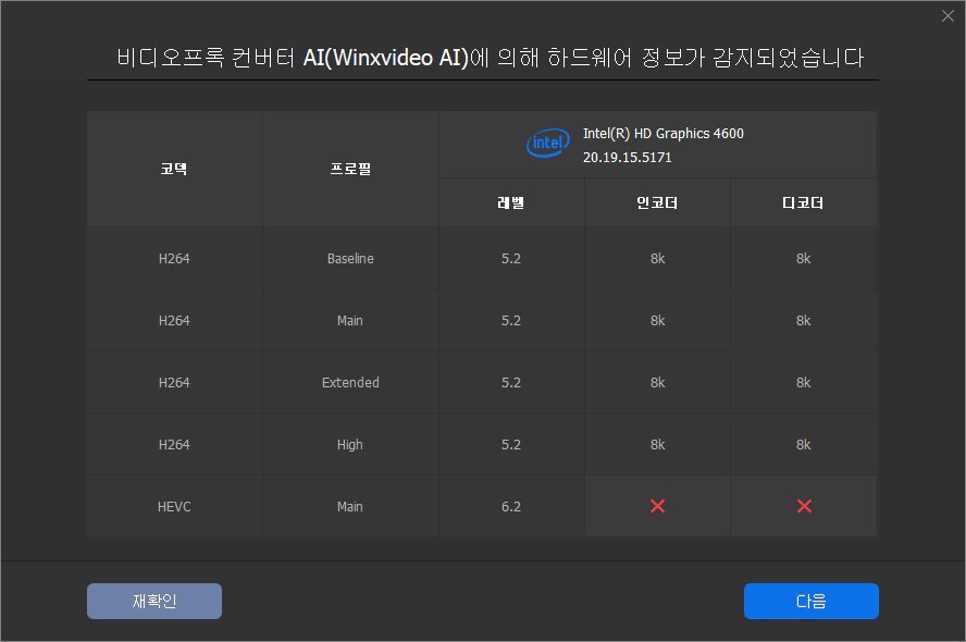 다음 화면에서 하드웨어 감지로 지원되는 코덱을 확인할 수 있네요. 저는 사무용 PC라서 그래픽 카드가 내장형이다 보니 성능이 좋지 못해 HEVC 코덱은 사용할 수 없네요.