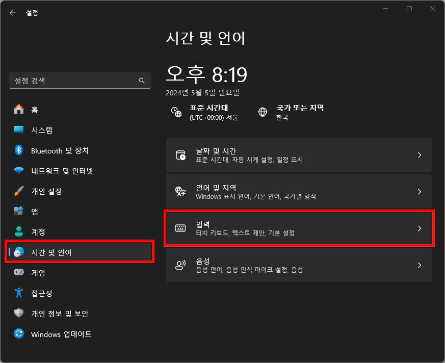 윈도우 11 설정 화면에서 왼쪽에 시간 및 언어를 선택하고 오른쪽에서 입력을 선택합니다.