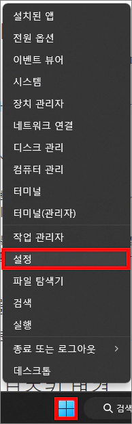 마우스로 윈도우 돋보기 기능을 실행하는 방법은 진짜 마우스만 있으면 누구나 실행 가능합니다. 하지만 조금 과정이 있어서 불편해요. 과정은 이렇습니다. 작업 표시줄 시작 버튼에 마우스 우클릭하고 메뉴에서 설정을 선택합니다.