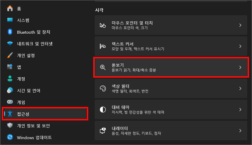 설정 창이 열리면 왼쪽에서 접근성을 선택해 주세요. 그리고 화면 오른쪽 시각 항목에 있는 돋보기를 선택하고 돋보기 관련 설정이 있는 화면으로 이동하면 됩니다.