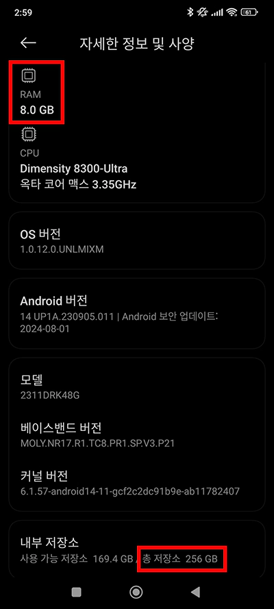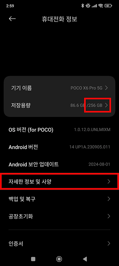 휴대전화 정보 화면으로 이동하시면 한 가지 사양을 확인할 수 있는데요. 저장용량입니다. 제가 사용하는 샤오미 포코 X6 프로(POCO X6 PRO) 기기는 저장 용량이 256GB, 512GB 두 종류로 출시가 되었는데 제가 구매한 제품은 256GB입니다. 하지만 가장 중요한 메모리 용량은 보이지 않아요. 확인하기 위해서는 자세한 정보 및 사양 메뉴를 터치합니다.