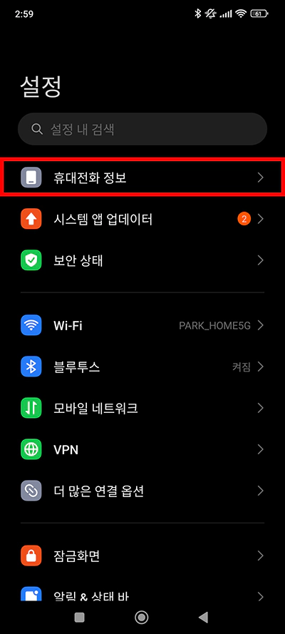 먼저 샤오미 스마트폰 설정 화면을 열어주세요. 다시 말씀드리지만 하이퍼 OS가 설치되어 있는 샤오미 스마트폰 대상으로 확인할 수 있는 방법입니다. 설정 화면 상단에 있는 휴대전화 정보 메뉴를 터치해 주세요.