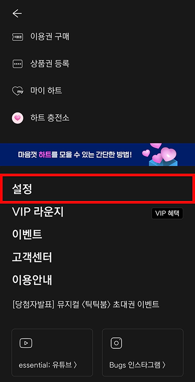 벅스(Bugs) 앱 메인 화면에서 오른쪽 상단 점 3개 찍혀있는 버튼을 터치하면 캡처 이미지와 같은 화면으로 이동하게 되는데요. 화면 아래쪽에 큰 글꼴 크기로 여러 메뉴가 있습니다. 첫 번째가 바로 벅스(Bugs) 앱 설정 화면으로 이동할 수 있는 메뉴입니다.