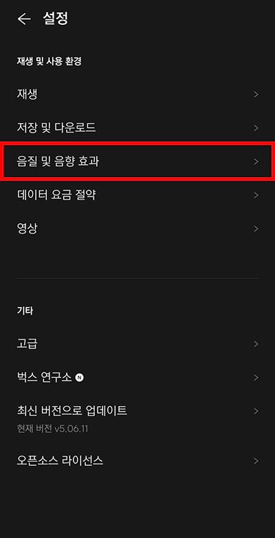 벅스(Bugs) 앱 설정 화면으로 넘어와서 메뉴를 살펴보면 재생 및 사용 환경 항목에 음질 및 음향 효과 메뉴가 있습니다. 음질과 음향 관련 설정을 할 수 있는 메뉴로 바로 이동해 보도록 하겠습니다.