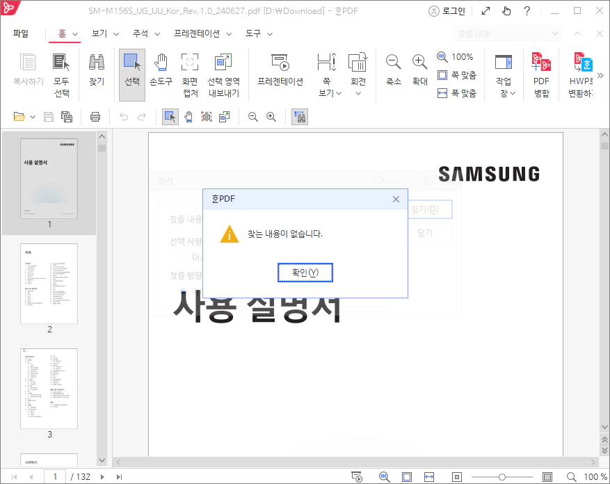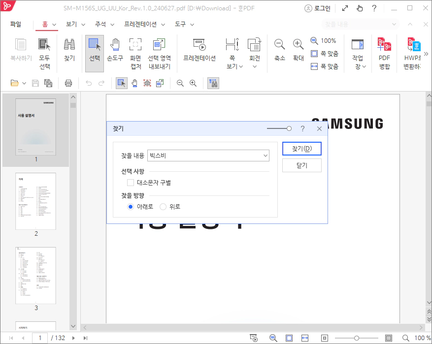 브라우저로 갤럭시 와이드7 매뉴얼 PDF 파일을 열어보거나 별도의 전용 프로그램으로 갤럭시 와이드7 매뉴얼 PDF 파일을 열었을 때 Ctrl + F 키를 눌러서 찾기 창을 열어볼 수 있습니다. 한글로 빅스비를 입력 후 매뉴얼 내용에 빅스비라는 단어가 사용되었는지 결과를 확인해 보면 갤럭시 와이드7 기기가 빅스비를 지원하는지 알 수 있겠죠.