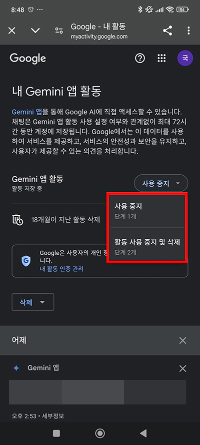 제미나이(Gemini) 앱 대화 기록 저장 해제
