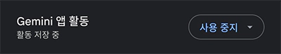 캡처 이미지에서 숫자로 표시했던 1번 설정입니다. 제미나이(Gemini) 앱 활동을 변경하는 설정인데요. 오른쪽 사용 중지를 터치해서 변경할 수 있습니다.