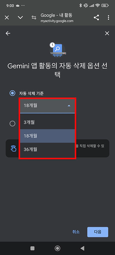 제미나이(Gemini) 앱 활동의 자동 삭제 옵션 선택 화면으로 넘어오시면 자동 삭제 기준이 보이실 거예요. 18개월로 선택되어 있는데 터치해 보시면 최소 3개월부터 최대 36개월까지 선택하실 수 있습니다. 만약 자동 삭제되는 것을 원하지 않는다면 자동 삭제 기준 밑에 있는 자동 삭제 안 함으로 변경하시면 됩니다.