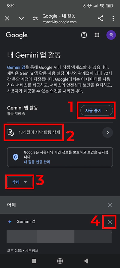 제미나이(Gemini) 앱 활동 관리를 할 수 있는 화면이 열렸습니다. 제가 캡처 이미지에 빨간색으로 숫자를 적었는데요. 4가지 삭제 방법이 있어서 모두 설명해 드리려고요. 아래 설명에서 순서대로 확인해 보시면 됩니다.
