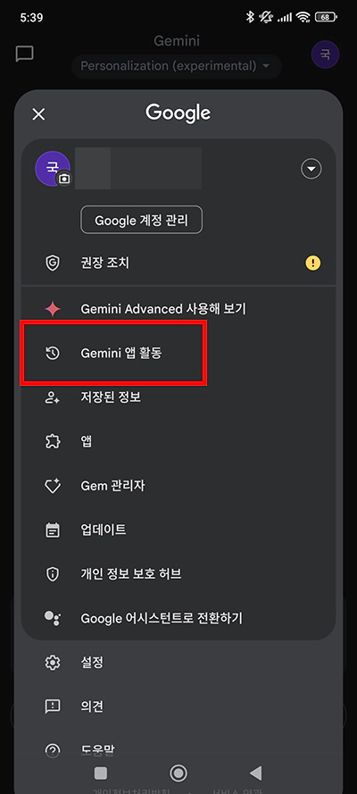 제미나이(Gemini) 앱 화면에서 오른쪽 상단 프로필 이미지를 터치하시면 캡처 이미지와 같은 메뉴 화면이 열리게 됩니다. 메뉴 화면 상단에 Gemini 앱 활동 메뉴가 있는데요. 대화 기록은 이 메뉴를 통해서 삭제를 진행할 수 있습니다.