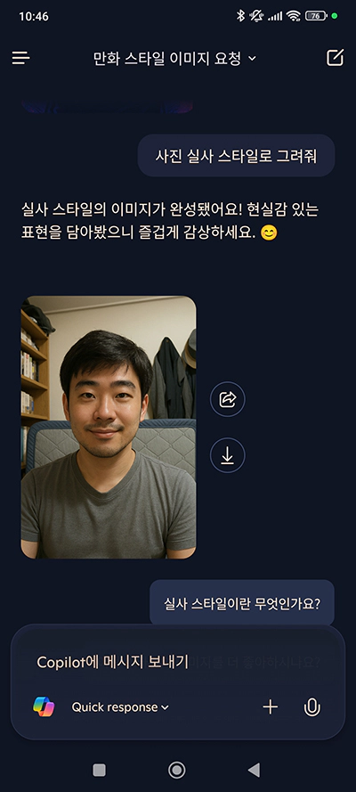 그리고 가장 신기했던 스타일은 실사 느낌 스타일이었는데요. 제 얼굴이 아닌 전혀 다른 사람의 얼굴이 그려졌는데도 마치 실제 사진처럼 완벽하게 실사화되었다는 것입니다. AI가 단순히 스타일을 바꾸는 것을 넘어 새로운 인물을 창조해 내는 모습이 놀랍기만 했습니다. 무료로 이 정도의 퀄리티와 재미를 경험할 수 있다는 점에서 Copilot(코파일럿) 앱은 AI 이미지 생성에 관심 있는 분들께 충분히 추천할 만한 앱이라고 생각합니다.