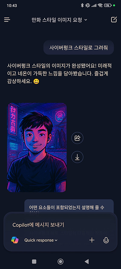 오늘 Copilot(코파일럿) 앱으로 제 사진을 이용해 AI 이미지 생성을 시도해 본 결과는 기대 이상으로 만족스러웠습니다. 특히 사진 속 배경을 거의 그대로 살려내면서도 다양한 스타일로 변환해 내는 점이 인상 깊었어요. 사이버펑크 스타일의 네온 배경이나 사진 실사 스타일의 뛰어난 색감은 정말 놀라웠죠.