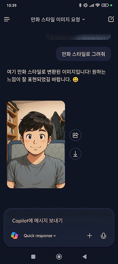 Copilot(코파일럿) 앱을 실행하고 제 셀카를 올린 뒤 만화 스타일로 그려달라는 명령어를 입력했습니다. 결과물을 만나기까지 생각보다 시간이 좀 걸리긴 했지만 캡처 이미지처럼 아주 깔끔한 만화 스타일 결과물이 완성되더라고요. 여기서 정말 놀랐던 부분은 캐릭터보다도 배경이었습니다. 제가 올린 사진 속 배경이 거의 그대로 그려져 나와서 깜짝 놀랐거든요