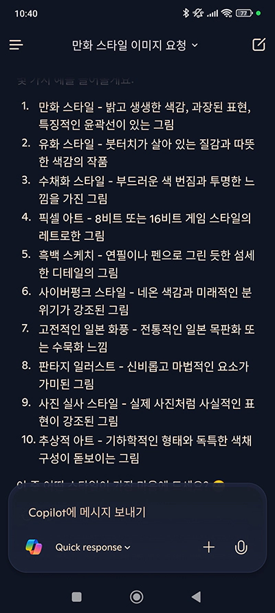 아주 만족스러운 결과물을 보고 나니까 Copilot(코파일럿) 앱에서 그려줄 수 있는 스타일은 어떤 것이 있는지 궁금해졌습니다. 리스트 형식으로 보여달라고 했더니 10가지 스타일을 보여주네요. 1번 만화 스타일은 처음에 확인을 해봤고. 목록에서 가장 관심이 갔던 몇 가지 스타일로 그려달라고 명령어를 입력해 보았습니다.