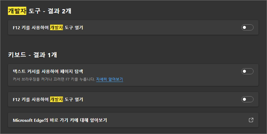 엣지 브라우저 설정 화면 왼쪽 상단을 보면 검색할 수 있는 공간이 있을 거예요. 검색하는 공간에 개발자를 입력하시면 오른쪽에 개발자 단어가 포함된 설정이 나오는데요. 동일한 설정이 2개 보이네요. F12 키를 사용하여 개발자 도구 열기 설정입니다. 같은 설정이기 때문에 한 곳만 클릭해도 2개 설정이 모두 변경되는데요. F12 키를 눌러도 개발자 도구가 열리지 않았던 분들은 해당 설정이 비활성화되어 있기 때문입니다. 오른쪽 스위치 버튼을 클릭해서 활성화로 변경하면 이제 F12 키를 눌러서 개발자 도구 화면을 열 수 있게 됩니다.