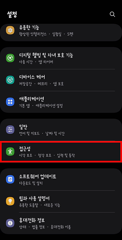 설정 화면에서 아래쪽으로 스크롤해 보시면 접근성 메뉴가 있을 거예요. 여기까지는 출시 날짜 상관없이 대부분 갤럭시 스마트폰에서 그대로 따라 진행할 수 있습니다.