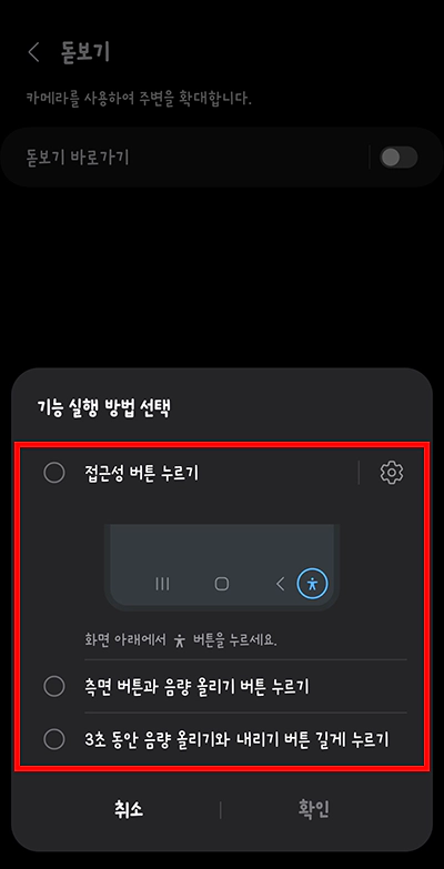 돋보기 설정 화면으로 넘어와서 상단에 있는 돋보기 바로가기 오른쪽 버튼을 터치하여 활성화해 주시면 하단에 위와 같은 화면이 열리게 됩니다. 돋보기 기능을 실행하는 작동 방법을 설정하는 화면인데요. 가장 쉬운 방법이 하단 내비게이션바 오른쪽에 접근성 버튼을 추가해서 터치하는 방법이네요. 접근성 버튼 누르기를 선택하고 확인 버튼을 터치하면 내비게이션바에 접근성 버튼이 추가되어 있는 것을 확인하실 수 있을 거예요. 이제 접근성 버튼을 터치하면 바로 돋보기 기능이 실행됩니다.
