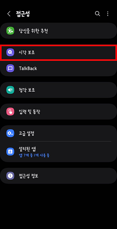 접근성 화면으로 넘어가시면 위와 같은 메뉴가 나오는데요. OneUI 버전에 따라서 메뉴 구성이 다를 수 있습니다. 시각 보조 메뉴가 있는 기기가 있고 시인성 향상 메뉴가 있는 기가가 있을 거예요. 시각 보조나 시인성 향상 메뉴를 터치해 주세요.